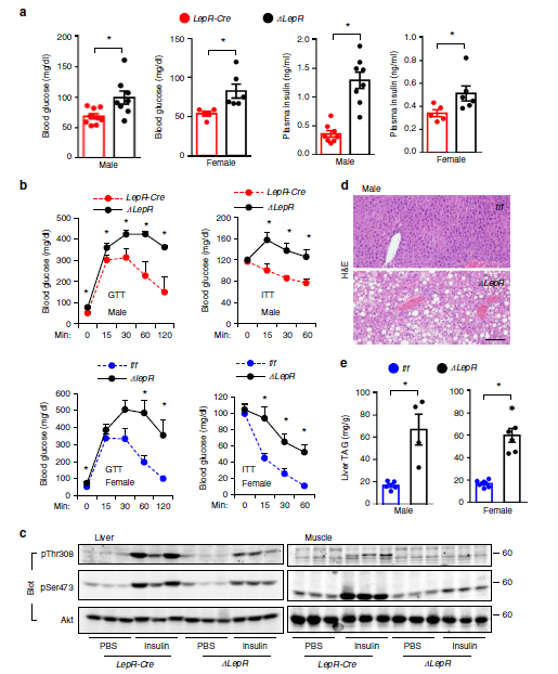 图1. Sh2b1ΔLepR小鼠形成胰岛素抵抗、葡萄糖耐受不良和肝脏脂肪变性.