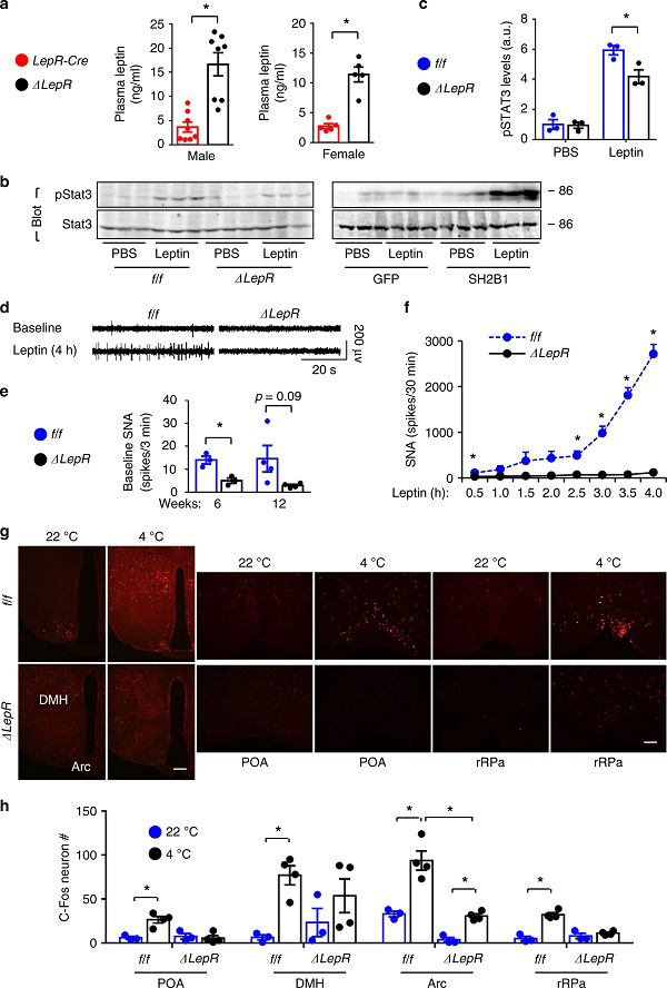 考虑到交感神经系统(SNS)在棕色脂肪激活中的关键作用,研究人员又评估了Sh2b1缺乏对瘦素刺激交感神经传递的影响。与对照小鼠相比,Sh2b1ΔLepR小鼠的交感神经活动显著降低。令人惊讶的是,LepR神经元中Sh2b1的缺失消除了瘦素刺激交感神经活动的能力。由此可见,瘦素刺激交感神经需要LepR信号通路的Sh2b1分支。