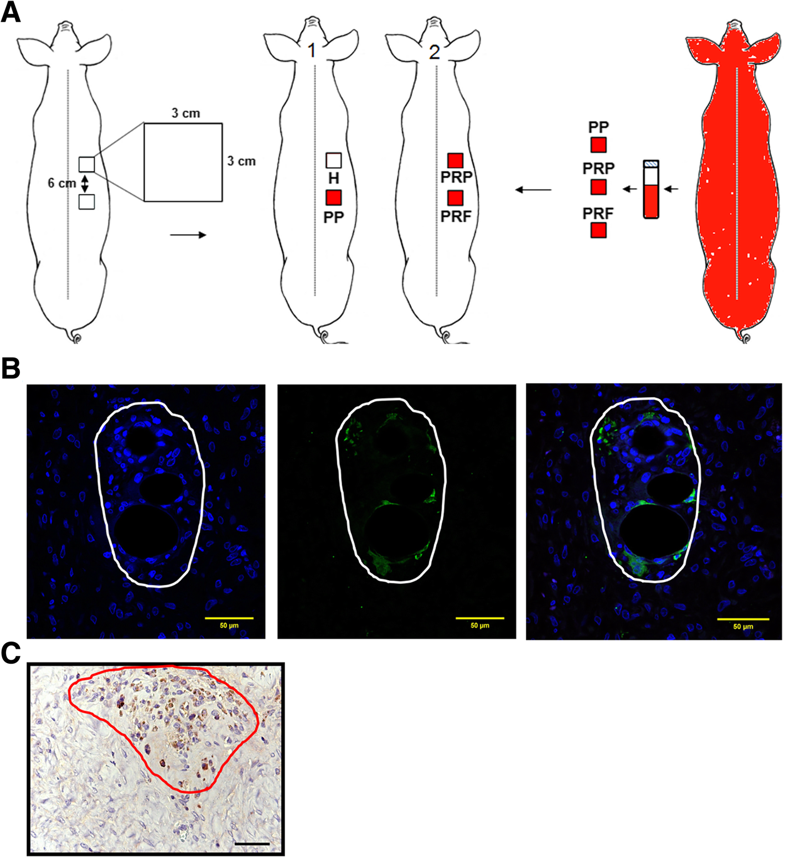 摘要:自体血小板浓缩物目前广泛用于再生医学的不同领域,以增强伤口愈合过程。虽然有几种血小板浓缩物的方案可用,但由于不同的方案导致不同的产品具有不同的潜在生物学用途,因此它们的应用仍然很困难。在本研究中,我们尝试使用富血小板血浆(PRP)注射和富血小板纤维蛋白(PRF)的混合物制作血小板贴片(PP),以促进伤口修复和再生。结果:实验采用小型猪全层创面模型。在猪的四处全层皮肤伤口形成前制备自体PRP、PRF和PP。我们量化血小板、凝血酶和各种生长因子的浓度,以确保产生预期的效果。术后应用亲水胶体敷料、PRP注射液、PRF和PP治疗实验性创面。通过测量创面大小和组织学检查评价其应用效果。结果表明,所有伤口均明显缩小。与PRP和PRF相比,P P治疗后的创面修复效果明显增强,创面收缩率明显高于PRF治疗。另一方面,以DsRed转基因猪为供血者的实验表明,PP中的白细胞在研究结束时被整合到伤口床中,这表明PP的应用刺激了白细胞活性。器官活检检查也证实了实验过程的安全性。结论:使用小型猪模型来评估实验室制备的聚丙烯对诱导的全层伤口愈合的效果。结果表明,在伤口护理中,使用一片PP足以获得与一般使用PRP或PRF相当的疗效。我们还证明了PP中的白细胞被整合到伤口床中,并且在整个实验中没有发现安全问题。本研究为兽医或临床伤口护理提供了一种新颖可行的方法。关键词:血小板浓缩物 富血小板血浆 血小板缺乏血浆(PPP) 富血小板纤维蛋白(PRF) 血小板贴片(PP) 全层创面背景:伤口愈合非常复杂,涉及到一系列有序的生理和分子事件。此过程始于止血,然后是炎症,细胞募集,迁移,增殖以及组织重塑和成熟,这些过程受多种细胞,细胞因子和生长因子的调节。在慢性伤口中,愈合因全身或局部因素而停滞,如糖尿病、静脉或动脉疾病、持续感染和潜在的代谢缺陷。无论伤口类型如何,对于寻求改进策略和敷料的伤口护理专业人员来说,实现高效和最佳的伤口愈合仍是一项重大挑战。富含血小板血浆(PRP)是一种由血小板和高浓度生长因子组成的血液衍生组分,在促进运动损伤后肌肉恢复、促进急慢性溃疡创面愈合、肌肉骨骼组织再生等方面受到广泛关注。自体PRP的一般制备方法采用一或两次离心,第一次离心产生三层,其中包括底部的红细胞,由高浓缩血小板和白细胞(PRP)组成的血沉棕黄层的中间层以及缺乏血小板血浆(PPP)层。在第二次离心之前,先去除上部的两层,然后再去除大部分的PPP层,以获得高度浓缩的血小板(PRP)层。然后加入凝血酶和钙以激活纤维蛋白原聚合,从而形成嵌入纤维蛋白网络中的浓缩血小板凝胶并准备使用。自体PRP使用和临床功效的当前标准是指其血小板浓度(> 106血小板/μL)和生长因子浓度增加3至5倍。迄今为止,已经开发了许多即时护理准备方案和设备。 富血小板纤维蛋白(PRF)是Dohan等人开发的第二代浓缩血小板。与PRP相比,PRF是在不使用抗凝剂的情况下通过一次离心制备的,全血凝血酶在离心过程中触发血小板活化和纤维蛋白原聚合形成纤维蛋白凝块。在这种凝块中,血小板与细胞因子、生长因子和白细胞一起被浓缩,从而在愈合和组织再生中产生最大功效。强机械强度的PRF保护生长因子免受蛋白质分解,支持延长释放。PRF已在许多领域中得到利用,以增强软组织,慢性腿部溃疡的愈合并促进骨骼再生并取得积极成果。利用PRP和PRF进行伤口护理的巨大兴趣得到了以下理论的支持:血小板是各种生长因子的贮存库,这些生长因子对组织修复和再生至关重要,并且在创伤中具有抗菌特性。因此,本研究的目的是将PRP与PRF结合形成一种新的材料,即血小板贴片(PP),并与传统的PRP与PRF进行比较。还将使用这些血小板衍生产品的伤口愈合与使用商业化的水胶体敷料的当前治疗进行了比较。在动物中创建全层皮肤伤口是研究PRP愈合效果的理想模型。在这项研究中,我们在小型猪中创建了全层伤口,作为急性伤口愈合的模型。 猪和人类皮肤之间的相似性使小型猪成为探索人类皮肤伤口愈合的准确模型。在使用前确定血小板和生长因子的浓度,并进行客观伤口大小测量和组织学检查以评估不同治疗的疗效。在研究结束时,用免疫荧光染色和免疫组织化学方法检测PP中的白细胞,以确定它们在创面床上是否存活。我们在这项研究中也进行了安全性验证。方法:六只小型猪,其中包括两只携带上述DsRed-单体报告基因猪,年龄约4月龄。自体PRF膜,PRP注射液和血小板贴剂(PP)的制备:从每头小型猪颈内静脉中抽取40毫升全血,立即用于制备自体PRP、PRF和PP。为制备PRF膜,在台式离心机上以1300×g离心8ml全血15min。产生三层,包括底部的红细胞、中间的结构性纤维蛋白凝块和顶部的无细胞血小板缺乏血浆(PPP)。收集纤维蛋白凝块,将其压在两块纱布之间,制备成可使用的PRF膜。收集含有自体凝血酶的渗出液,与注射器一起使用。为制备PRP注射液,将32ml全血在650g下离心5min,形成三层。然后,将PPP的顶层和血沉棕黄层的中间层(BC)都转移到新的无菌试管中,以1300xg的速度进行第二次离心15分钟。产生了三个新的层,其中顶部的大部分PPP被移除并用于其他地方,而剩余的PRP(一些PPP+BC+残余红细胞,1 mL)被来自方案1的0.5 mL自体凝血酶激活以产生PRP注射液(方案2)。PRP注射液(1.5ml)用于伤口周围直接注射。在这项研究中,我们将PRP与PRF结合使用以生产用于伤口