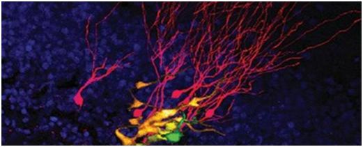 新生神经元(黄色、橙色和红色)位于神经干细胞(绿色)附近。这些神经元在两个月的时间里在成年小鼠的海马体中生长图片来自University of Zurich。过去的研究已鉴定出不同的神经干细胞群体,但是追踪它们在活体小鼠大脑中随时间变化的情况却一直很困难。海马体中存在这些干细胞的部分称为齿状回(dentate gyrus),位于大脑深处,因此科学家们必须移除位于它上方的组织才能观察活体小鼠中的神经干细胞,并且他们需要示踪剂对他们想要观察的这些特定的干细胞进行标记。在2018年发表在Science期刊上的一篇论文(Science, 2019, doi:10.1126/science.aao5056)中,作为苏黎世大学Sebastian Jessberger实验室的一名博士后研究员,Pilz及其同事们描述了他们如何监测经过在Ascl1驱动下表达的绿色荧光蛋白(GFP)标记的神经干细胞发生的细胞分裂。Ascl1蛋白在神经分化中起作用。据报道,这些神经干细胞经历“快速的神经遗传爆发(neurogenetic burst)”,从而使得它们在两个月或更短的时间内平均产生5个神经元,然后在小鼠大脑中消失。相比之下,在他们的最新实验中,Pilz及其同事们追踪的一些神经干细胞的寿命相对较长。这些神经干细胞经过在Gli1驱动下表达的GFP标记,在长达90天的时间里会产生五个神经元,随后才消失。Gli1蛋白也在神经发生中起作用。Pilz告诉《科学家》杂志,这些结果表明,齿状回中的神经干细胞存在“多样性”。他所在团队的研究也开始揭示有关分子和细胞差异的细节,这些差异决定着神经干细胞一旦开始分裂就可以存活多长时间,并且还可能为衰老过程中导致神经发生水平下降的细胞机制提供线索。Pilz指出,他的团队在这些最新实验中研究的是青春期小鼠,而非成年小鼠,不过他说,这种技术已使得该团队开始追踪在小鼠从青春期过渡到成年期的过程中它一直在追踪的不同神经干细胞群体的命运。他说,这些实验可能揭示衰老是否会对这些细胞谱系产生不利影响。他的团如今还可以观察当这些小鼠动物在运动或社交---这两者都与成年小鼠神经发生的增加有关---时这些神经干细胞和新的神经元群体发生了什么。Pilz说,这些结果可能确定了“实际上有助于神经发生、激活这些神经干细胞或支持神经元存活的生理条件”。