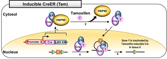 雌激素诱导型Cre,即CreER系统,也叫他莫昔芬(Tam)诱导的Cre系统。将Cre与雌激素受体ER融合,可通过他莫昔芬(Tam)诱导Cre的重组活性。在没有他莫昔芬的情况下,CreER融合蛋白与热休克蛋白90(HSP90)相互作用并存在于细胞质中。在给予他莫昔芬的情况下,他莫昔芬(Tam)作为抗雌激素药物会与雌激素受体ER结合,从而破坏HSP90与CreER的相互作用,诱导Cre释放并进行核易位。在细胞核中,CreER识别loxP位点并使相应组织中的基因Y失活。