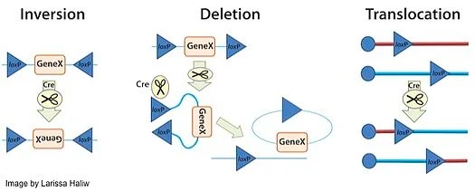 当基因内存在loxP位点且有Cre重组酶存在时,Cre重组酶便会与loxP位点两端的反向重复序列区结合形成二聚体。此二聚体与其他loxP位点的二聚体结合,进而形成四聚体。随之,loxP位点之间的DNA序列被Cre重组酶切掉,切口通过DNA连接酶重新连接。DNA重组结果主要取决于loxP位点的方向及位置,主要存在以下几种重组方式: