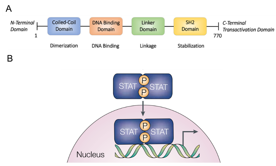 然而在致癌信号的刺激下,STAT3会被持续的激活,以活化的状态恒定存在于细胞核中,持续激活靶基因,促进肿瘤细胞的增长[5-6](图1B)。