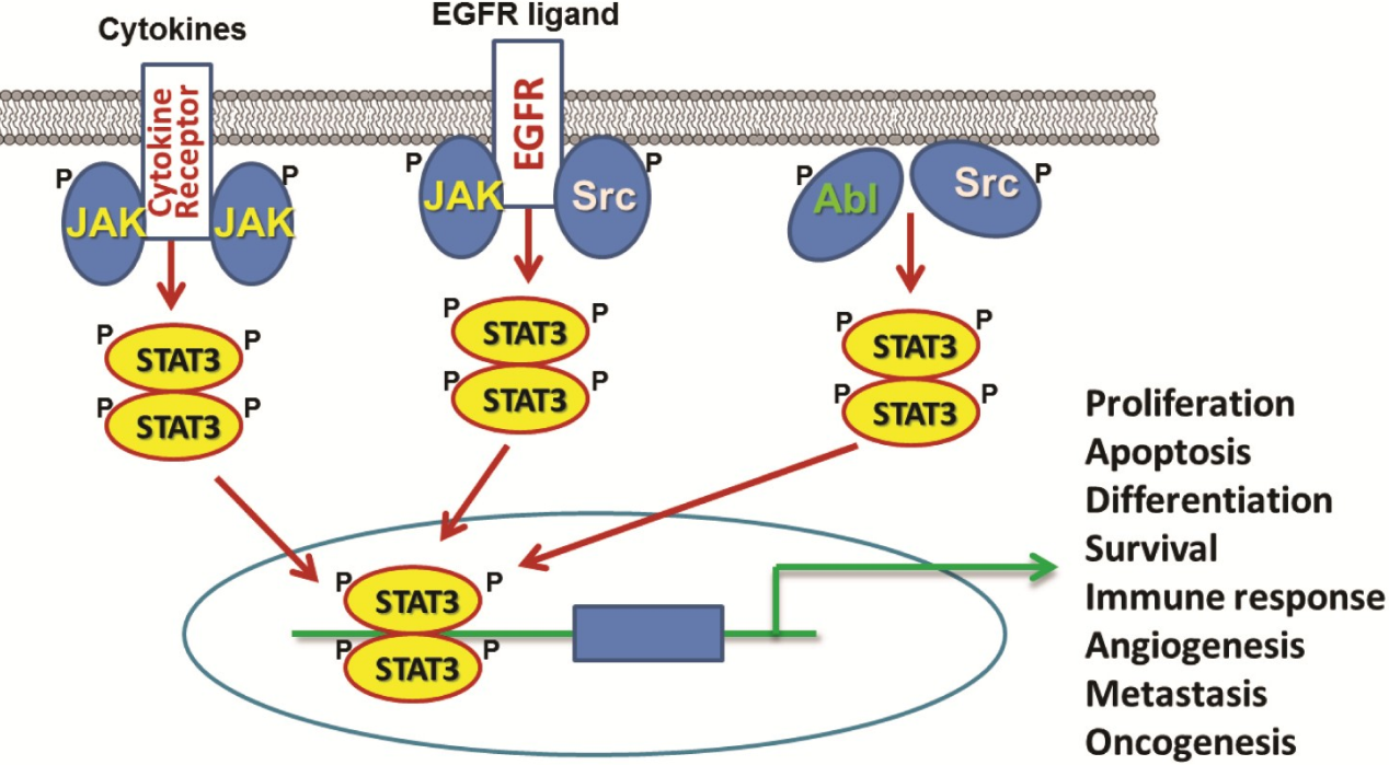 STAT3是许多细胞因子(白细胞介素IL-6,IL-10和IL-11等)、生长因子(Fibroblast growth factor,FGF;Vascular endothelial growth factor ,VEGF等)、以及一些原癌基因(K-Ras,Src和cAbl等)激活的信号通路的汇合点。