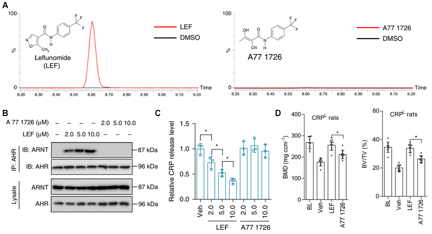 首先,CRP背后受何人指使?有报道称,CRP的表达受芳香烃受体(AHR)信号通路的负调控。这里简单介绍一下,AHR需要配体的激活才能发挥作用,其配体一般需要同时满足芳香化合物结构特征和疏水性两个条件。在配体的刺激下,AHR转移到细胞核中并与ARNT(芳香烃受体核转运体)结合后调控下游基因转录7。他们惊喜地发现:作为DMARDs一份子的LEF本身(而非其代谢产物A77 1726),竟然也可以作为AHR的激动剂(图5A)。真是无巧不成书,我们的问题1在这里找到了答案。