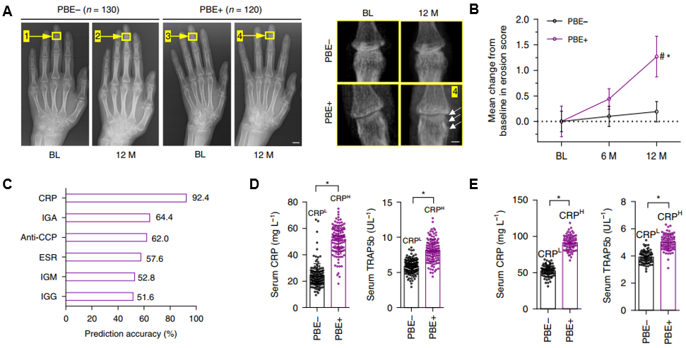 首先,他们将RA病人按病情分成已经发生骨侵蚀(PBE-positive, PBE+)和尚未发生骨侵蚀(PBE-negative, PBE−)两组共计250位病人,全部接受Leflunomide治疗12个月后发现只有PBE−组(130位)病人病情得到缓解(图3A,B)。紧接着他们对比了剩下120位PBE+组病人的血清学指标基线,发现了有趣的现象:PBE+组病人血清中C反应蛋白(CRP)水平比PBE−组更高,血清抗酒石酸酸性磷酸酶(TRAP5b,骨侵蚀指标)的释放也更多(图3C,D)。在胶原蛋白诱导关节炎(CIA)的大鼠模型中他们也得出类似的结果(图3E)。