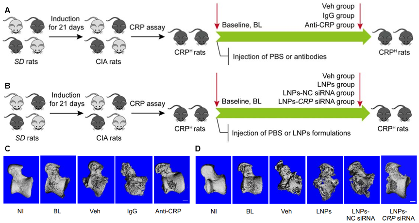 为了证实这一推断,在CIA诱导的RA大鼠模型中,吕教授团队在大鼠的关节内注射CRP特异性抗体(图4A,C),或将siRNA通过尾静脉输送至CRP产生的源头——肝脏抑制其表达(图4B,D),用这两种方法阻断CRP的功能后,RA模型大鼠的骨侵蚀程度均得到不同程度的缓解。以上结果证实了CRP的确是造成RA病人骨侵蚀的罪魁祸首。