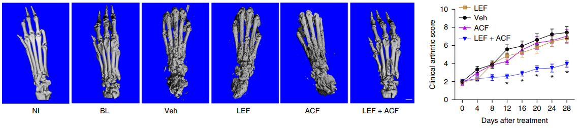 对这部分难治性RA病人,科学家们并没有放弃。来自香港浸会大学吕爱平(Aiping Lu)、张戈(Ge Zhang)团队与香港中文大学中药学院张保亭(Bao-Ting Zhang)团队合作发现:LEF与Acriflavine联用可作为治愈RA的全新精准医疗策略4。这一研究发现发布在10月8日的《自然通讯》(Nature Communications)杂志上(图2)。