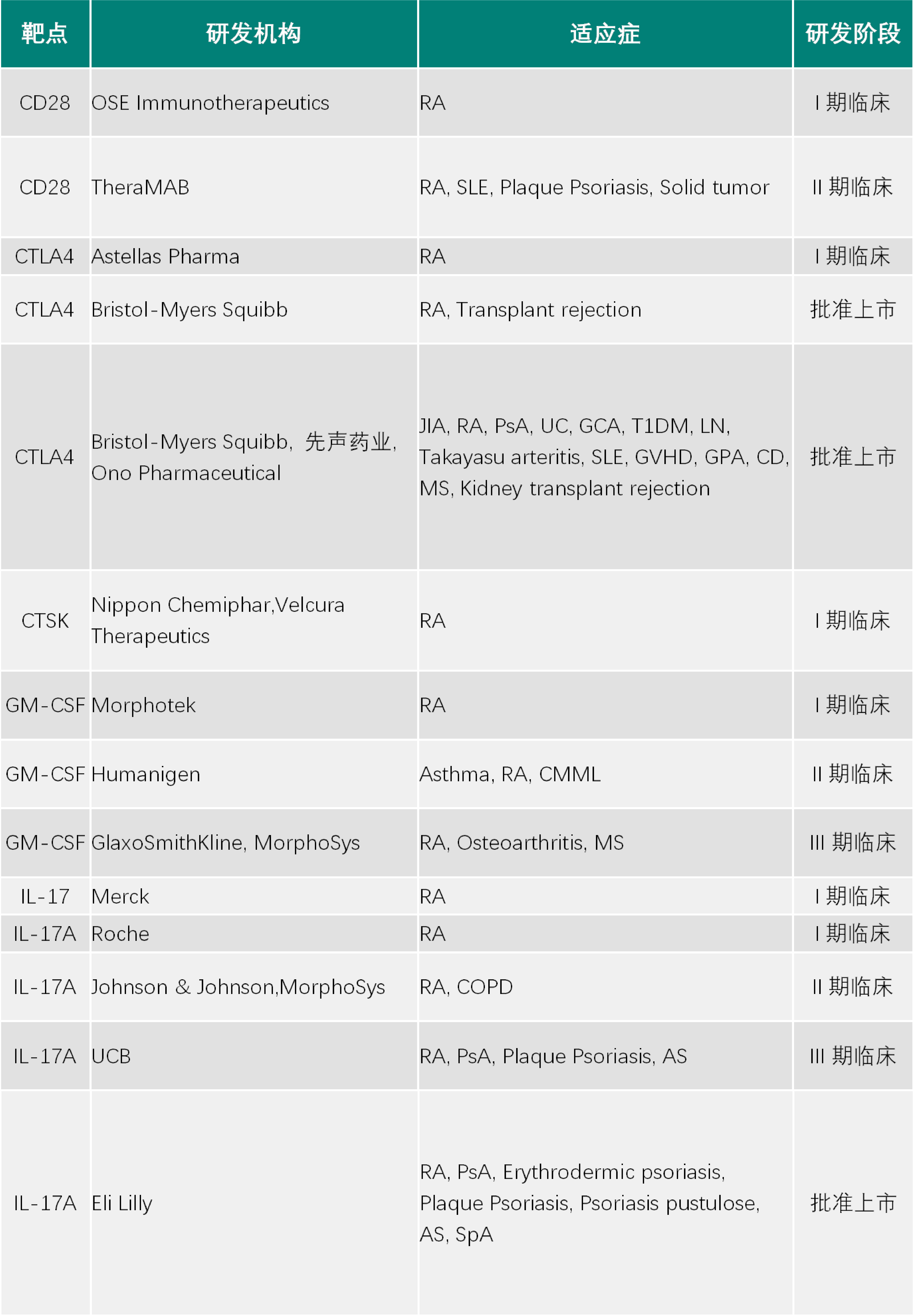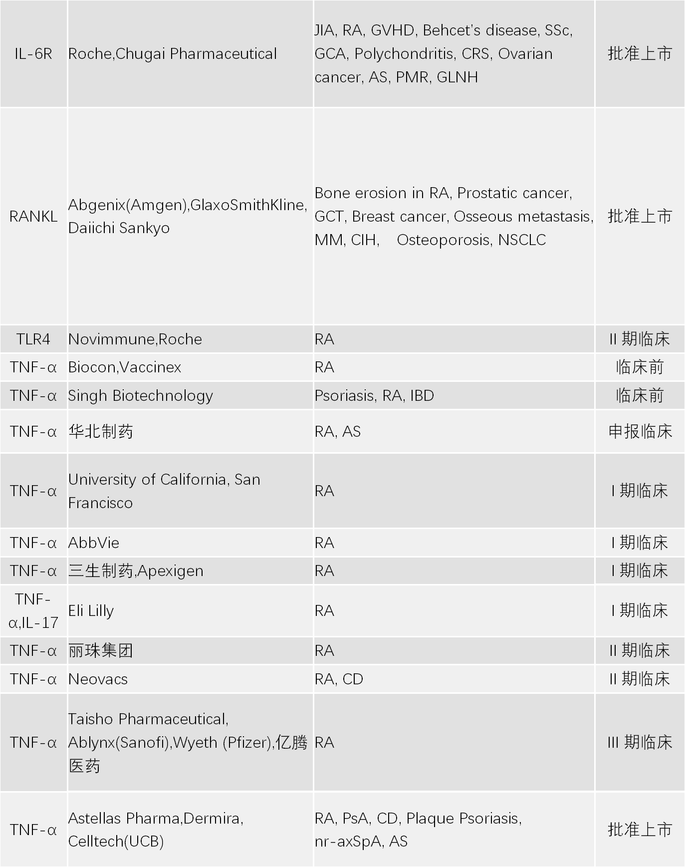 实际上,除了CRP-HIF1α通路外,还有很多不同类型的免疫细胞和炎症因子相互交错成阶层式调控网络,在RA发病过程中扮演不同的角色。在药物研发领域中,已有不少炎症因子及其受体作为潜在的治疗靶点被开发,有些靶点已经在临床取得不俗的成绩(表1)。