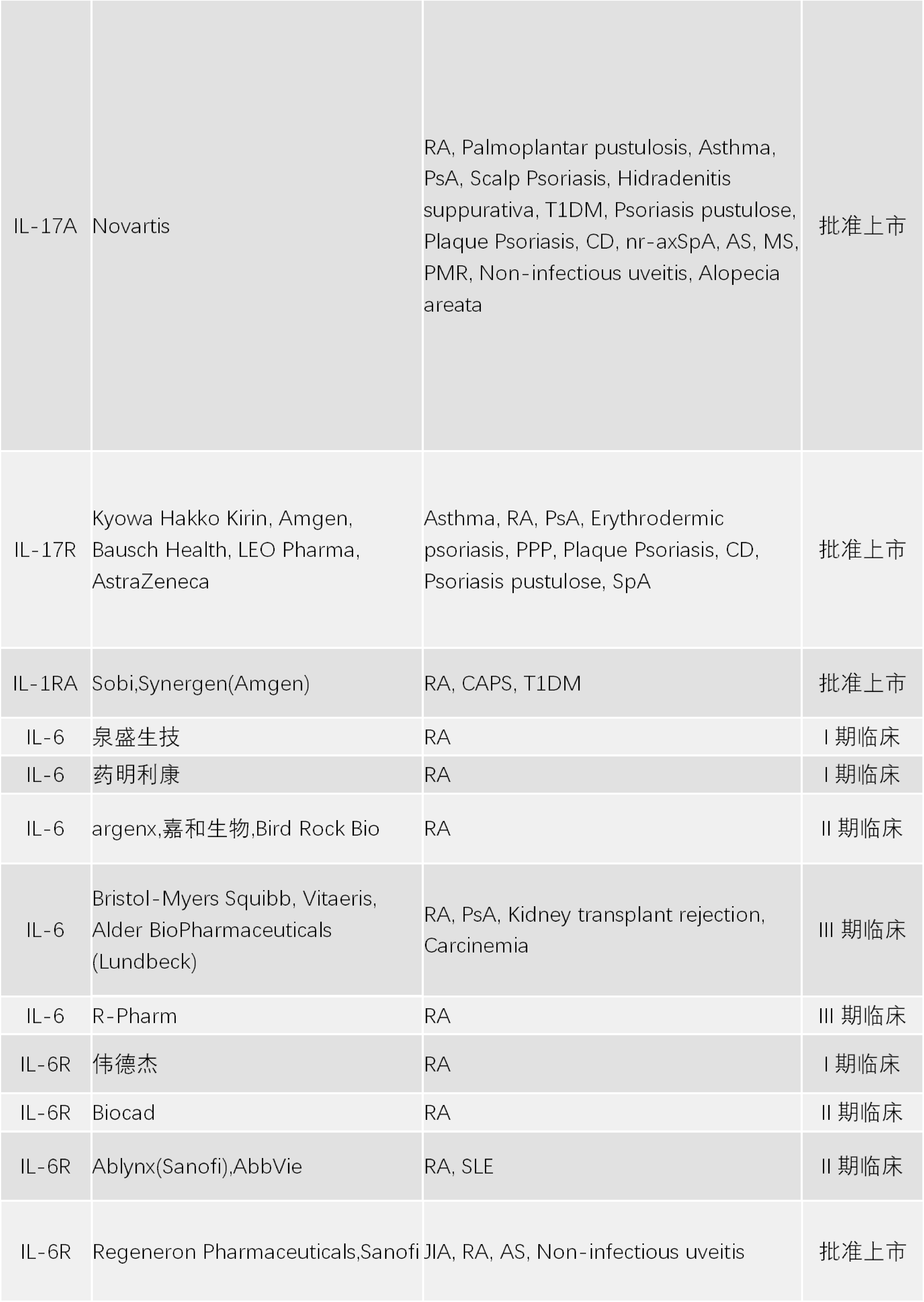 表1.部分炎症因子及其受体靶向药物的临床研究进展(数据来源:医药魔方数据库,集萃药康整理,滑动查看)