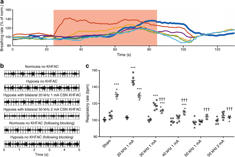 摘要:现在出现了一种新的治疗方法,称为生物电药物,目的以病理状态下的个别神经纤维或特定脑回路为靶点,修复功能丧失,恢复健康平衡。颈动脉窦神经(CSN)去神经支配已被证明能改善胰岛素抵抗和葡萄糖不耐受大鼠的葡萄糖稳态;然而,随着时间的推移,手术带来的这些积极影响似乎逐渐减少,严重的副作用导致化学感觉功能永久性丧失。在这里,我们描述了一种新型的生物电子应用,即千赫频率交流(KHFAC)调制,抑制啮齿动物CSN内的神经信号的能力。方法:在14周内给大鼠吃杂粮或高脂肪/高蔗糖(HFHsu)饮食(60%富含脂肪的饮食加35%的蔗糖饮用水)。神经接口被双侧植入脑脊液中,并与外部脉冲发生器相连。然后将大鼠随机分为KHFAC或假调制组。通过呼吸和心脏对缺氧的反应(10%的氧气+90%的氮气)来明确KHFAC调制变量。通过ITT和OGTT的葡萄糖耐量定期评估胰岛素敏感性。结果:对CSN的KHFAC调制,应用超过9周,2型糖尿病大鼠模型胰岛素敏感性和糖耐量恢复。停药后5周内胰岛素抵抗和糖耐量恢复正常。结论:在2型糖尿病大鼠模型中,CSN的KHFAC调节改善了代谢控制。这些积极的结果具有重要的翻译潜力,作为一种新的治疗方式,目的是治疗人类代谢性疾病。关键词:颈动脉体 颈动脉窦神经 葡萄糖耐量 胰岛素抵抗 KHFAC调制 神经调节 2型糖尿病摘要:2型糖尿病的主要缺陷是外周胰岛素抵抗、肝葡萄糖代谢异常和进行性胰岛β细胞衰竭。2型糖尿病中的血糖控制随着时间的推移逐渐恶化,在单独饮食和运动失败后,平均每3-4年需要用降血糖剂进行一次新的干预,以获得/保持良好的控制。我们之前已经证明,通过外科切除其敏感神经来消除颈动脉体活动,颈动脉窦神经(CSN),通过重建交感神经活性,恢复高能量脂肪动物胰岛素抵抗和葡萄糖耐受模型的胰岛素敏感性和葡萄糖耐受性;这种代谢变量的重新建立与胰岛素敏感组织中胰岛素信号的恢复以及肝脏和内脏脂肪组织对葡萄糖摄取的改善有关。我们检验了抑制CSN活性是早期2型糖尿病的一种可持续治疗策略的原理证明,即通过在先前暴露于高脂肪/高蔗糖(HFHsu)饮食中14周的大鼠中双侧切除CSN来治疗早期2型糖尿病。事先知道手术切除脑脊液容易引起与周围缺氧反应丧失相关的副作用,降低对二氧化碳的敏感性,运动反应受损和血压波动,我们试图确定可逆法是否能诱导饮食诱导的早期糖尿病大鼠长期血糖控制而无明显副作用。一种新的治疗方法正在出现,这种方法可以精确检测和调节周围神经系统中的电信号模式,即生物电医学。认识到目前可用于代谢性疾病的治疗方法不能提供对该疾病的长期控制,加上显著的副作用,生物电子医学方法可通过TARG显著提高2型糖尿病的护理标准。阻断淋巴结代谢途径并避免系统性影响。此外,生物电药物可能在患者中有很高的接受度,因为它们只需要微创手术,同时对日常活动的依从性和干扰可以忽略不计。在目前的研究中,我们测试了使用双边千赫兹交流电流(KHFAC)调制来抑制CSN活性,因为这种方法已经被证明能有效地阻断体细胞神经中的神经传导。有人认为,KHFAC的作用是由于对动作电位传导的直接抑制。这是在1–100 kHz的频率范围内实现的,体内评估的最高频率为50和70 kHz。手术操作:雄性SD大鼠(230-280g,年龄14-16周)。恢复试验使用Wistar?大鼠,(200-300g,8-9周龄)在恢复实验中,动物被盲法分为两组:第一组接受标准周粮,第二组接受高脂高脂饮食,在14-15周内诱发2型糖尿病(60%高脂饮食加35%饮用水蔗糖)。定期记录体重,每天监测饮食和耗水量。CSN切除:分别使用ITT和OGTT评估胰岛素敏感性和葡萄糖耐量后,动物在氯胺酮(30 mg/kg)和甲苯嗪(4 mg/kg)麻醉和丁丙诺啡(10μg/kg)镇痛下接受双侧CSN横断,如前所述。对照组接受假手术(每组8-10例)。CSN卡肤电极植入术:为了评价持续性KHFAC调制对CSN的影响,将1组(非疾病模型)和2组(糖尿病模型)动物植入CSN卡肤电极。大鼠急性实验用氨基甲酸乙酯(i.p.1.5 g/kg)麻醉,恢复实验用美托咪定/氯胺酮麻醉。双极卡肤电极与CSN双侧连接。纤维蛋白胶用于将卡肤固定在脑脊液上,防止电流从卡肤末端扩散。从卡肤电极引出的导线在颈部背侧皮下穿通,通过一个安装在头骨上的经皮连接器在头部外部穿通,并用环氧树脂包裹,形成一个头盖。植入后,在5赫兹和300μA的刺激下,呼吸频率增加约2 s,证实电极放置正确。使用阿替帕米唑(0.25 mg/kg,2 ml,i.p.)逆转麻醉。大鼠术后用止痛药丁丙诺啡(10μg/kg,s.c.)治疗,并用消炎卡普洛芬(5 mg/kg,s.c)治疗2-3天。动物开始KHFAC调节前恢复10天。肌电图和心电图记录:用于肌电图(EMG)和心电图电极的肋间铂丝在横膈膜上皮下放置。利用Plexon多通道采集处理器数据采集系统对心电图和肌电图数据进行了差异化记录,并在Matlab中进行了分析。CSN的KHFAC调制:KHFAC调制以矩形脉冲的形式应用于卡肤电极的两侧:频率为20 kHz、30 kHz、40 kHz时,电流为1 mA或频率为50 kHz,电流为2 mA。. 在经皮连接器中,来自两个卡肤的电线是平行连接的,因此电流在卡肤之间根据它们的阻抗被分开。为了确保接近等电流分裂,在植入前在生理盐水(154mmol/L NaCl)中测量卡肤电极阻抗,根据每只动物阻抗值的差异<10%,对每只动物的卡肤进行匹配。假设电流源输出等于50/50%,则每个卡肤的电流值报告为峰间值。电流源仅在0–4.2 mA(峰-峰)范围内使用,因为较高的范围在频率约为10 kHz时提供了明显的电流衰减,这