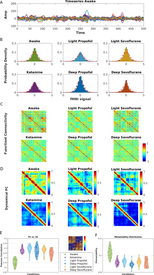 图1、动力学分析。A) 一只猴的时间序列示例,清醒状态,500个时间点,重复时间2400 ms(TR)。B) 每种情况下的功能磁共振信号分布图。所有情况均有显著性差异。C) 每种情况下的功能连接矩阵(FC),CoCoMac,82个皮层区域。D) 每种情况下一个受试者的动态功能连接性(dFC)示例。E) 每个受试者的FC和结构连接性(SC)之间的Pearson相关。