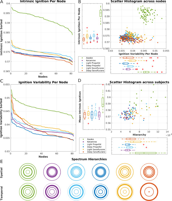 取内点燃值和点燃可变性,每个节点一个点,生成散点图。明显分开了;一个对应于清醒状态(绿点),另一个对应于镇静状态。右侧的方框图显示了每种条件下各个节点的内点燃值分布。清醒值明显高于其他麻醉条件。氯胺酮麻醉与轻度异丙酚、轻度七氟醚和深度七氟醚麻醉有显著差异,但与深度异丙酚麻醉无显著差异。轻度异丙酚麻醉在每个结点处的内点燃值略高,在统计学上不同于深度异丙酚和深度七氟醚麻醉,但与轻度七氟醚麻醉没有区别。轻度七氟醚麻醉是清醒状态和轻度异丙酚镇静后的第三高内点燃值。异丙酚深度麻醉的内点燃值明显低于轻度七氟醚麻醉,而稍高于深度七氟醚麻醉。最后,轻度七氟醚麻醉和深度七氟醚麻醉也存在统计差异,如方框图所示。为量化这些差异而进行的效应大小分析也支持这些发现。这些结果支持这样一种观点,即在不同的条件下,层级组织的空间维度受到不同程度的破坏。这种干扰至少分为三类:清醒、轻度和深度镇静作用。
