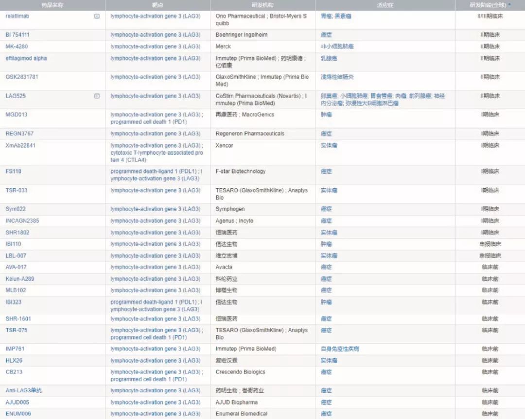 抗肿瘤免疫疗法在近几年掀起研究热潮,Checkpoint 许多药物已获得了临床批准用药并取得了可喜的成绩,尤以PD-1和CTLA-4为代表,美国FDA已经先后批准了靶向CTLA-4、PD-1、PD-L1三个免疫检查点的多款单克隆抗体上市,这些药物在国内也已有多款上市。然而,人体免疫调节机制复杂,免疫靶点既有激活型靶点(如CD137, OX40)也有抑制靶点(如PD-1, LAG-3),近期肿瘤免疫疗法领域的研发热点就集中到了LAG-3、TIM-3、TIGIT等通路。这些靶点多与免疫抑制相关,多家公司针对LAG-3也正在开发相应的药物,而且这些药的初步临床数据可观,期待LAG-3日后能成为另一“明星靶点”。