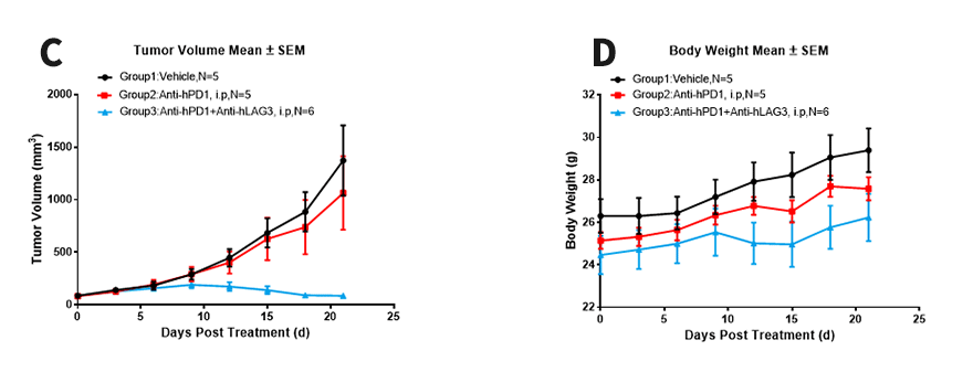 结果显示:anti-hPD1单药组对肿瘤生长抑制作用小(TGI=20.11%),anti-hPD1和 anti-hLAG3联用组对肿瘤生长抑制作用大(TGI=98.02%)(图C),小鼠体重变化趋势一致(图D)。