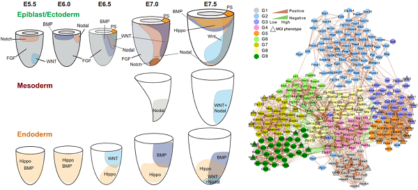图3. 胚层关键信号作用区域及关键转录因子调控网络绘制了小鼠胚胎E5.5-E7.5时期外、中、内三胚层的关键信号通路作用区域;不同颜色代表不同组的转录因子;棕色连接线代表正相关,绿色连接线代表负相关,连接线的粗细代表相关程度;MGI数据库中敲除小鼠表型与原肠运动异常的标注为三角符号。本研究主要由中国科学院分子细胞科学卓越创新中心/生物化学与细胞生物学研究所景乃禾课题组、中国科学院-马普学会计算生物学伙伴研究所韩敬东课题组与中国科学院广州生物医药与健康研究院彭广敦课题组共同合作完成,中国科学院广州生物医药与健康研究院彭广敦研究员、中科院马普计算生物研究所索生宝博士、生物化学与细胞生物学研究所的崔桂忠博士和禹方博士为该论文的共同第一作者,景乃禾研究员、韩敬东研究员和彭广敦研究员为该论文的共同通讯作者。该工作得到了中国科学院动物研究所周琪研究员、悉尼大学Patrick P.L. Tam教授、生化与细胞所化学生物学技术平台、高性能计算存储与网络服务平台和动物实验技术平台的大力支持。这项工作得到了中国科学院战略性先导科技专项、国家重点研发计划、国家自然科学基金委员会、广东省科学技术基金、广州再生医学与健康广东省实验室前沿探索项目、上海市自然科学基金和上海市科学技术委员会的资助。Reference:1. Aibar, S., Gonzalez-Blas, C.B., Moerman, T., Huynh-Thu, V.A., Imrichova, H., Hulselmans, G., Rambow, F., Marine, J.C., Geurts, P., Aerts, J., et al. (2017). SCENIC: single-cell regulatory network inference and clustering. Nature methods.2. Cao, J., Spielmann, M., Qiu, X., Huang, X., Ibrahim, D.M., Hill, A.J., Zhang, F., Mundlos, S., Christiansen, L., Steemers, F.J., et al. (2019). The single-cell transcriptional landscape of mammalian organogenesis. Nature.3. Chan, M.M., Smith, Z.D., Grosswendt, S., Kretzmer, H., Norman, T.M., Adamson, B., Jost, M., Quinn, J.J., Yang, D., Jones, M.G., et al. (2019). Molecular recording of mammalian embryogenesis. Nature.4. Chen, J., Suo, S., Tam, P.P., Han, J.J., Peng, G., and Jing, N. (2017). Spatial transcriptomic analysis of cryosectioned tissue samples with Geo-seq. Nature protocols 12, 566-580.5. Nowotschin, S., Setty, M., Kuo, Y.Y., Liu, V., Garg, V., Sharma, R., Simon, C.S., Saiz, N., Gardner, R., Boutet, S.C., et al. (2019). The emergent landscape of the mouse gut endoderm at single-cell resolution. Nature.6. Peng, G., Suo, S., Chen, J., Chen, W., Liu, C., Yu, F., Wang, R., Chen, S., Sun, N., Cui, G., et al. (2016). Spatial Transcriptome for the Molecular Annotation of Lineage Fates and Cell Identity in Mid-gastrula Mouse Embryo. Developmental cell 36, 681-697.7. Pijuan-Sala, B., Griffiths, J.A., Guibentif, C., Hiscock, T.W., Jawaid, W., Calero-Nieto, F.J., Mulas, C., Ibarra-Soria, X., Tyser, R.C.V., Ho, D.L.L., et al. (2019). A single-cell molecular map of mouse gastrulation and early organogenesis. Nature.