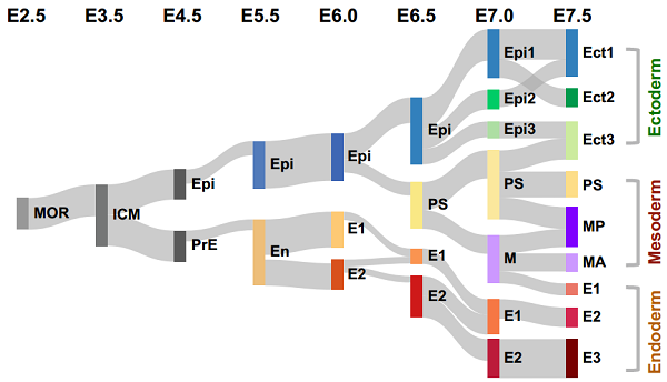 图1. Geo-seq样品收集示意图和二维数据可视化(corn-plot)Geo-seq收取E5.5-E7.5五个时期的上胚层/外胚层和内胚层,收取E7.0和E7.5时期的中胚层。根据胚胎大小和胚胎结构的复杂程度,分不同区域收取。对三维空间转录的基因表达进行平面化展示,构建corn-plot。红色代表高表达,不同的点代表不同的样品。为揭示不同时期、不同空间位置的胚胎细胞在胚层谱系上的联系,研究人员借鉴更具生物学意义、更加稳健的SCENIC数据分析方法(Aibar et al., 2017),结合着床前胚胎的转录组数据,将发育过程中最重要的时间和空间信息联合分析,构建了小鼠早期胚胎发育过程的系统发生树,并从分子层面重构了胚层谱系的发生过程。发育生物学的传统观点认为,内胚层主要由原肠运动过程中原条迁移出来的细胞构成。而这一研究的最新发现是,内胚层细胞可能很早就发生细胞命运特化,三胚层谱系建成时的内胚层与原始内胚层之间存在更紧密的联系。同时发现,部分外胚层和中胚层具有共同的前体细胞。这将指导发育生物学研究人员进一步通过谱系追踪等遗传学方法,研究胚层谱系建立和细胞命运决定,促进干细胞生物学研究人员对神经外胚层多能干细胞的研究,完善体外肝细胞、胰岛B细胞和脊髓神经细胞等器官前体细胞的分化体系,推动细胞治疗和药物筛选工作的发展。