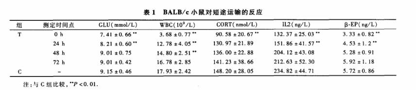 如研究表明,短途运输会引起小鼠代谢、神经内分泌系统和免疫系统的功能均发生广泛而显著的变化,有文献报道BALB / c小鼠和ICR 小鼠,经1. 5 h 运输后,小鼠血糖( GLU) 、外周白细胞总数( WBC) 、血清中皮质酮( CORT) 、白细胞介素2( IL2) 和β-内啡肽( β-EP) 均会明显降低。不过在72h之内会逐渐恢复。