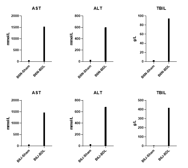 上图为模型组和对照组肝功能指标AST、ALT、TBIL的数据对比