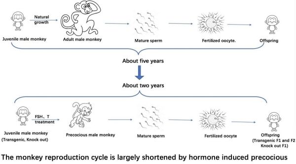 脑智卓越中心、上海脑科学与类脑研究中心、中科院灵长类神经生物学重点实验室孙强、熊志奇和刘真团队合作,在National Science Review上在线发表了题为《基于外源激素诱导性早熟的遗传修饰猴加速传代》的研究论文。科研人员通过给予处于少年期的食蟹猴(0.5岁、1岁、2岁)外源FSH和睾酮后,发现实验猴在外源FSH和睾酮处理4-11个月后得到具有正常活力的精子。通过该法处理,获得精子食蟹猴的最小年龄为15个月。所得精子可以高效地用于胚胎构建,并得到子代个体(最短22个月内),移植胚胎出生率与自然繁育接近。