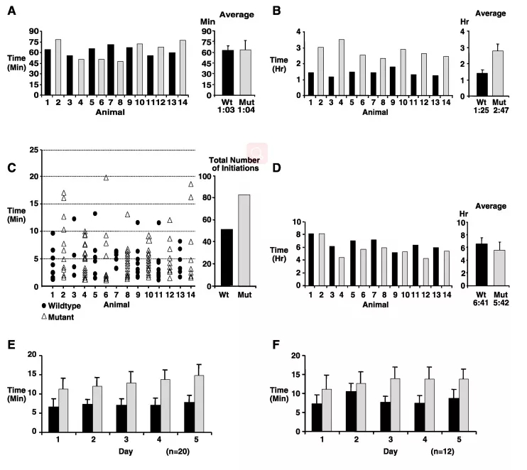 Hoxb8突变纯合小鼠似乎具有正常的运动控制,此外,饲养和筑巢似乎都正常。相比之下,当分析理毛行为时,发现Hoxb8突变小鼠与对照之间存在显著差异,当计算梳理时间的比例时,发现Hoxb8突变小鼠在理毛行为上花的时间几乎是其对照的两倍;此外,突变小鼠梳理了它们身体的所有区域,并且在执行这些动作时似乎没有困难。很明显,相对于同窝对照,Hoxb8突变纯合小鼠花费了过多的时间舔身体。这些Hoxb8突变小鼠表现出过度的舔和咬身体导致了它们大量的毛发脱落和伤口。