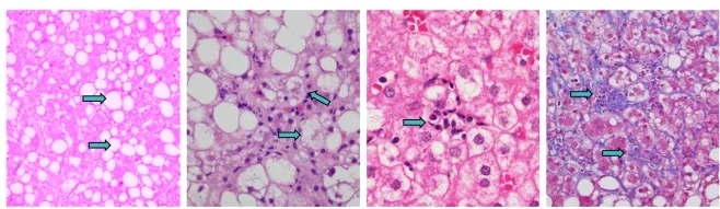 图1. 来自NAFLD患者肝脏活检的图像展示了肝脏脂肪变性(空泡结构)、肝细胞气球样变性、小叶炎症和细胞周围纤维化的典型表现[1]