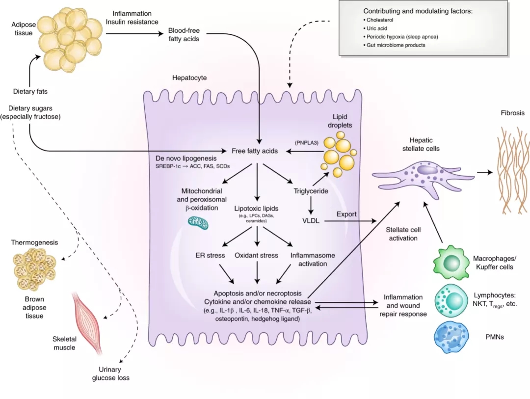 图2. 游离脂肪酸是NASH发病机制的核心。源自脂肪组织中甘油三酯脂解作用的游离脂肪酸通过血液输送到肝脏。脂肪酸在肝细胞中的两个主要途径是线粒体β-氧化和再酯化以形成甘油三酯。甘油三酯可以作为低密度脂蛋白进入血液或储存在脂滴中。脂滴甘油三酯经过调节的脂解作用,将脂肪酸释放回肝细胞游离脂肪酸池。当通过β-氧化或甘油三酯的形成对脂肪酸的处理不堪重负时,脂肪酸会导致脂毒性物质的形成,从而导致内质网应激、氧化应激和炎症小体激活。这些过程是NASH表型的原因,包括肝细胞损伤、炎症、星状细胞活化和过量细胞外基质的逐渐积累[1]。