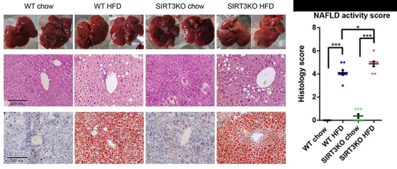 在C57BL/6小鼠中敲除Sirt3基因后得到的Sirt3敲除小鼠在高脂饮食(HFD)诱导下表现出肝脏沉积更多的脂质,肝脏变性程度更高,总体的NAFLD进程更严重[5]。