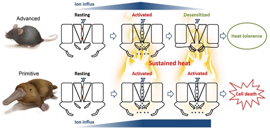 RPV1热失活的分子机制及其对哺乳动物高温耐受的生物学意义(中科院昆明动物研究所供图)5月14日,中国科学院昆明动物研究所研究员赖仞、杨仕隆团队联合浙江大学教授杨帆团队及加州大学戴维斯分校教授郑劼团队在《自然—通讯》发表论文,揭示了TRPV1通道的热失活分子机制及其在哺乳动物进化中的重要生物学意义,表明TRPV1热失活对高等哺乳动物而言是一个至关重要的高温保护机制。TRPV1是哺乳动物重要的温度感知元件,可以被40℃以上的高温激活,但TRPV1高温激活后会迅速发生高温介导的失活。TRPV1热激活和热失活两个变构过程紧密偶联,因此难以对TRPV1热失活的分子机制进行有效研究,进而无从得知TRPV1在哺乳动物生命活动中的功能。研究人员表示,揭示哺乳动物TRPV1热失活的分子机制,关键是需要获得一种仅发生热激活而不发生热失活的TRPV1,这样才能以此作为模板,开展相关分子水平和动物水平的研究。基于物种进化分析和功能研究,研究人员获得了仅发生热激活而不发生热失活的鸭嘴兽TRPV1。借助通道的嵌合体构建、非天然氨基酸标记、荧光共振能量转移和变构构象模拟等技术,他们发现TRPV1发生热失活依赖于胞内N-端和C-端的相互作用,进而带动孔区变构并关闭。而鸭嘴兽的TRPV1不具有热失活的特性,因此不具有这一变构过程。为探索TRPV1热失活的生物学意义,研究人员构建了鸭嘴兽trpv1(p-trpv1)转基因敲入小鼠。结果发现,野生型小鼠比p-trpv1小鼠更加耐受长时程热刺激,p-trpv1小鼠会通过持续的行走来规避热板的刺激。不仅如此,长时程的热板刺激会灼伤p-trpv1小鼠足底,但对野生型小鼠并无显著影响。由此可见,TRPV1热失活是高等哺乳动物应对高温环境的一种保护机制。而鸭嘴兽作为最原始的哺乳动物之一,其TRPV1尚未进化出高温介导的“激活—失活”平衡机制。因此,鸭嘴兽对25℃以上的环境极其敏感,难以适应其分布地区较高的陆地生存环境。相关论文信息:DOI: 10.1038/s41467-019-09965-6 中国科学家研究揭示哺乳动物高温保护机制