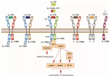 研究表明Th17细胞以及相关的IL17、IL22 、IL23 等细胞因子参与到多种自身免疫疾病发展过程中[1]。其中IL17家族细胞因子可以动员、募集及活化中性粒细胞,从而介导炎症反应的产生,并参与到自身免疫疾病的发病过程中(如图1)。所以针对于IL17靶点相关的抗自身免疫药物一直是研发的热点。目前IL17抗体药物已经应用在银屑病、类风湿性关节炎等自身免疫疾病的治疗中。而IL17抗体药物针对于多发性硬化症的研究也处于临床研究阶段。