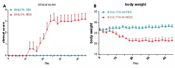 在小鼠EAE 模型中,其免疫系统受到MOG诱导,攻击中枢神经系统髓鞘蛋白,导致小鼠产生不同程度的运动障碍、瘫痪等症状。是目前研究多发性硬化症的常用模型和药效评价工具。百奥赛图利用B-hIL17A小鼠构建的EAE模型,可以检测IL17相关的人源化抗体药效,助力药物的临床前研究。