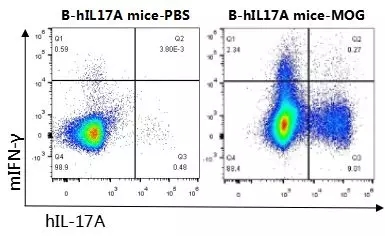 取EAE小鼠模型淋巴结检测hIL17A、mIFN-γ等细胞因子,结果显示MOG诱导EAE模型的淋巴结CD4+细胞能够表达hIL17。