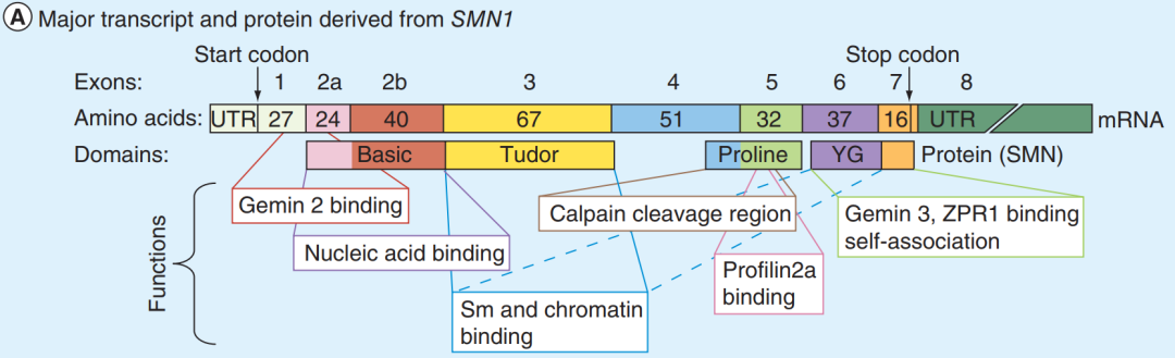 图2. SMN1结构。图中显示人类SMN1成熟的mRNA和蛋白线性化的结构区域。箭头指示的是翻译起始和终止位点。不同区域内部的数字表示氨基酸数量。下方则是对该基因的不同功能区进行注释。信息来源:10.4155/FMC.14.63.