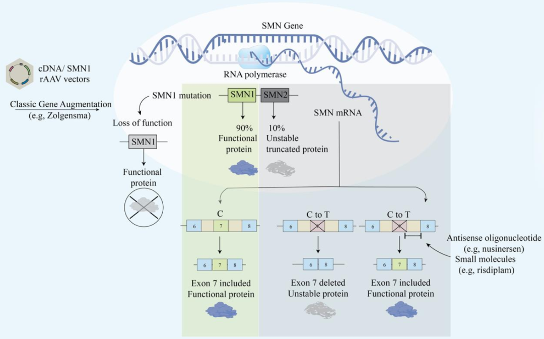 人类SMN基因分为SMN1和SMN2, SMN1基因位于端粒侧,转录后产生全长mRNA,SMN2基因位于着丝粒侧,SMN2基因与SMN1基因在外显剪接增强子处有一个核苷酸的差异,从而使得转录后的SMN2缺失第7个外显子,编码截断的SMN蛋白,截断的SMN蛋白丧失全长SMN蛋白的功能,并且在细胞内迅速降解。生理状态下,SMN2 mRNA的第7个外显子在有些情况下并不是全部缺失,SMN2基因仍然能够产生一小部分(10-15%) 全长mRNA,这部分mRNA可编码具有正常功能的SMN蛋白。不过,仍有一部分SMN2的转录(大约10-15%左右)能够突破封锁生成完整的mRNA,进而合成有功能的蛋白。研究发现95%的SMA是由SMN1基因发生突变引起的,SMA患者体内由于SMN1基因的缺失,不能产生足够的SMN蛋白。在疾病状态下,体内SMN蛋白主要来源于SMN2基因,由于SMN2基因只有少部分可产生功能性SMN蛋白,因此SMA主要是由体内SMN蛋白的缺乏而引起。