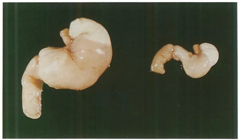 图2. Nos1 -/-纯合敲除小鼠(左)和野生型对照小鼠(右)的胃。[2]