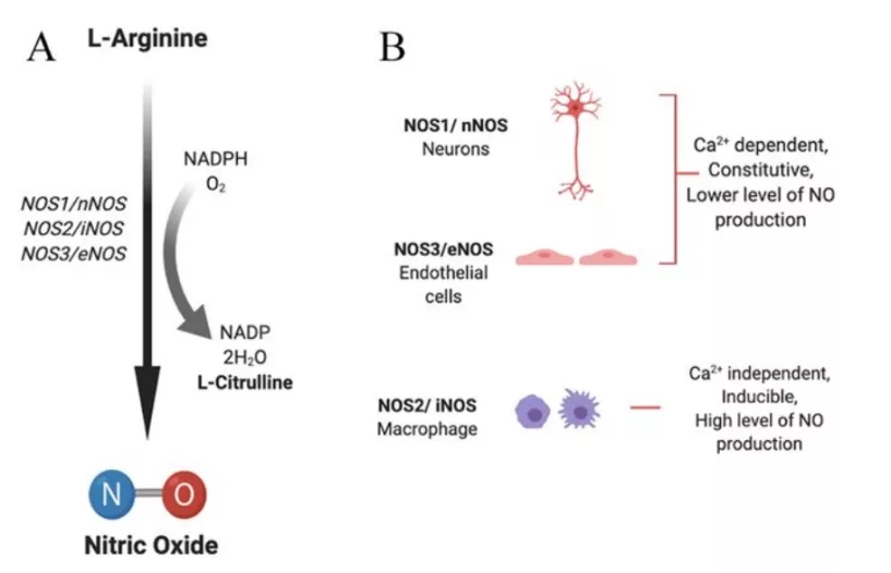 图1. (A)一氧化氮的合成;(B)一氧化氮合酶(NOS)亚型:神经元(NOS1/nNOS)、诱导型(NOS2/iNOS)和内皮型(NOS3/eNOS)。[1]