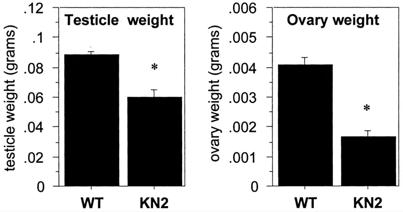 图3. 野生型与Nos1纯合敲除小鼠的性腺重量:Nos1纯合敲除小鼠的睾丸和卵巢的重量均显着降低。[3]