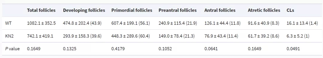 表1. 野生型和Nos1纯合敲除小鼠卵巢的卵泡计数。[3]