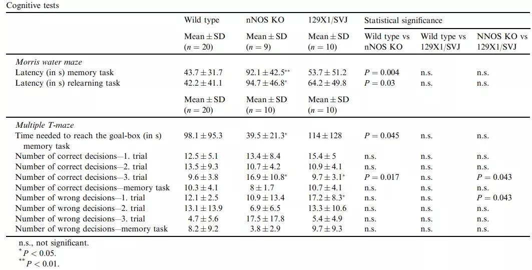 研究人员对3个月大的雄性Nos1纯合敲除小鼠通过Morris水迷宫 (MWM) 和多T迷宫(MTM) 研究认知功能。为了研究神经学和行为的影响,进行了一系列的观察性测试:旋转棒、高架迷宫(EPM)、开放场(OF)和社交互动测试。在Morris水迷宫的记忆和再学习任务中(压力条件),大多数纯合敲除小鼠都失败了,但在MTM 中表现更好。纯合敲除小鼠表现出梳理频率和进入OF中心的频率显著增加。触摸-逃脱反应、身体位置、运动、骨盆和尾部抬高以及发声减少的得分显著增加。在EPM中,在闭合臂上花费的时间和梳理频率显着增加,没有排尿。因此得出结论,纯合敲除小鼠在MWM中表现出空间表现受损,并证实了Nos1在记忆加工、维持和回忆等认知功能中的作用。但纯合敲除小鼠在MTM中表现良好,这是在低压力环境下;这一事实也表明,Nos1抑制仅影响压力条件下的认知功能。