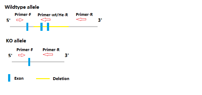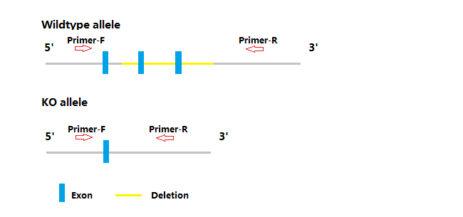 在敲除的片段两端设计引物,扩增后电泳。理论上敲除成功的小鼠扩增出的片段大小=野生型小鼠的片段大小-敲除的片段大小,所以可通过电泳图的条带大小来进行鉴别,但实际上,若敲除的片段过大,有的酶是扩增不出来野生型片段的,比如有的酶,1.5K以下基本可以P出条带,大于1.5K的大部分是P不出的,所以当野生型的条带无法扩增时,这对引物就不能鉴定纯杂合了。
