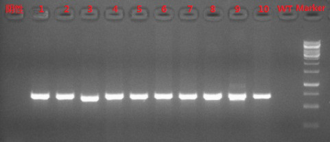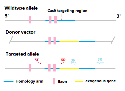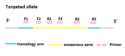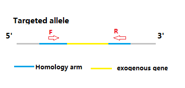 在5’同源臂及3’同源臂设计引物测同源臂序列。设计两对引物,一对位于靠近5’同源臂的基因组及插入片段(5F和5R)上,一对位于靠近3’同源臂的基因组及插入片段(3F和3R)上。如果插入该片段成功的小鼠,其样本可以扩增出该片段,电泳结果有相应的条带;若插入失败,则扩增不出片段,电泳结果为没有条带。