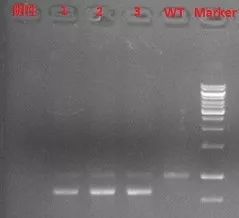 敲除的片段较大时,野生型相应的片段往往扩增不出来。电泳结果若是无条带,则为野生型;若是只有一条条带,则为敲除小鼠(纯合或杂合)。(条带大小=野生型片段大小-敲除片段大小)