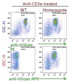 结果显示:在C57BL/6小鼠活化腹腔细胞里,可检测到mSIRPα+细胞。在B-hSIRPα纯合鼠活化腹腔细胞里,可检测到hSIRPα+细胞。