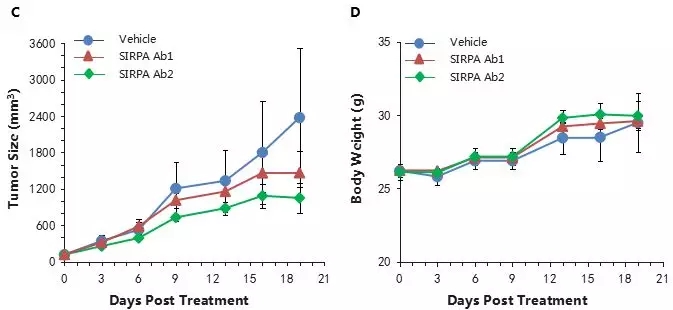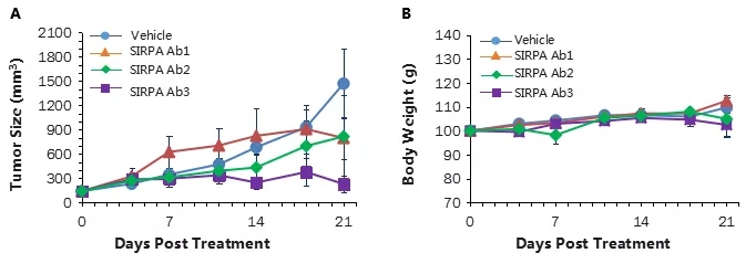结果显示:不同的人SIRPA抗体对肿瘤生长抑制作用不同, 证明B-hSIRPA小鼠是评估人SIRPA抗体体内药效的有力工具。 A. 肿瘤平均体积±SEM,B. 小鼠平均体重±SEM。