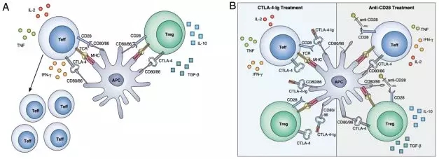 科学家们也对这一事故的原因进行深入的研究分析。造成这一毒性反应主要原因是CD4+ T细胞短期集中释放大量的细胞因子,其中包括:肿瘤坏死因子(TNF),干扰素(IFN)和白细胞介素(IL)等。而TGN1412(CD28抗体)可以刺激CD4+ CD45RO+ 释放细胞因子。但临床前的动物实验却没有反应出此药物潜在的毒性问题。此原因可能是由于用于实验的小鼠周龄较小且生长环境干净,使得它组织驻留的CD4效应记忆细胞(CD4EM)是比较缺乏的,CD28抗体引起的反应很容易被Treg细胞所抑制。即便科学家在将CD28抗体应用于小鼠之前立即去除Treg细胞,大量的循环TNF,IL-2和IL-6变得可检测,但小鼠并没有表现出明显的反应[4]。而在猴子体内虽然有CD4+ T细胞,但CD28的表达确是缺乏的, 故没有受到TGN1412抗体激动[5]。在人体内,虽然剂量远远低于动物实验剂量,但能够已触发大量的细胞因子释放导致强烈的毒性反应。