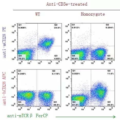 结果显示:在C57BL/6小鼠活化T细胞里,可检测到mCD28+细胞。在B-hCD28纯合鼠活化T细胞里,可检测到hCD28+细胞。