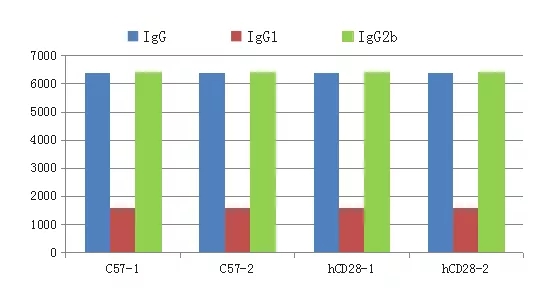 利用hPDL1-his重组蛋白与CFA乳化后免疫C57BL/6和B-hCD28小鼠。14天后检测免疫后小鼠血清中IgG1,IgG2a, IgG2b各亚型特异性抗体效价。检测结果无显著差异,说明hCD28小鼠B7-1/CD28共刺激信号途径正常,嵌合CD28分子具有正常生物学活性。