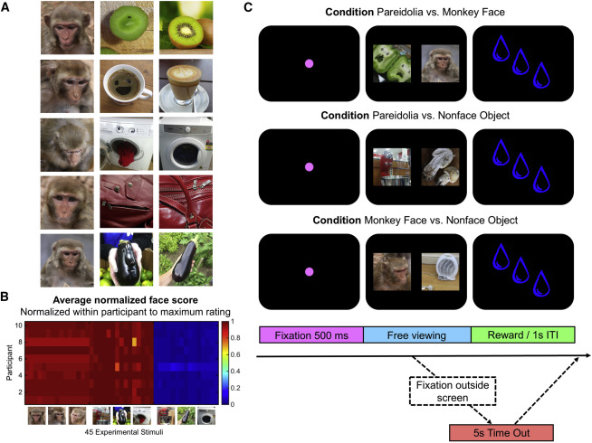 摘要:人类和非人类灵长类动物的面部感知快速准确。在人脑中,视觉处理区域的网络是专门面向面部的。虽然人脸处理是灵长类视觉系统的一个优先事项,但人脸检测并不可靠。脸部错觉症是指在无生命的物体上感知脸部特征的令人信服的错觉,例如月球表面的虚幻脸部。虽然面部错觉通常由人类经历,但它在其他物种中的存在是未知的。在视觉偏好任务中,猴子观察人类观察者诱发面孔错觉的物体的照片的时间比观察不诱发幻觉的类似物体的照片的时间长。对眼球运动的研究显示,猴子把虚幻的面部内部特征固定在一个与他们观察面部照片的方式一致的模式中。例如,错觉狂可能是人类感知抽象能力的产物,或者是由于经常接触卡通片和插图而导致的,这些卡通片和插图将无生命的物体拟人化。相反,我们的结果表明,对无生命物体的虚幻面部特征的感知是由我们与其他物种所共有的广泛调谐的面部检测机制驱动的。关键词:面孔感知 脸部识别 视觉偏好 猴子行为 眼球运动结果和讨论:为了评估恒河猴是否面部错觉狂,我们聚焦于人类观察者判断的虚幻面孔自然发生的例子。我们收集了15张来自公共领域的无生命物体(例如,食物、器具和工具)的照片,这些物体被展示来促进对虚幻面孔的感知,另外还有15张等同物体的照片,这些物体没有被感知为包含虚幻面孔。 我们通过收集十个观察者的行为评分,确认了独立的人类观察者在每个刺激中要么察觉到一张虚幻的面孔,要么察觉不到一张虚幻的面孔。我们测试了猴子是否在诱发人类面部偏瘫的刺激中感知到虚幻的面部结构,使用已建立的范例,该范例已被成功地用于测量非语言受试者的面部检测,包括人类婴儿和恒河猴。在自由观看的视觉偏好任务中,我们给猴子呈现了一对刺激物,并测量了它们观察每个刺激物的时间。. 众所周知,人类和猴子面部看起来比其他刺激物长。因此,如果猴子在与人类相同的物体中感知到虚幻的脸部结构,那么它们应该花更长的时间观察包含虚幻脸部的物体,而不是观察不包含虚幻脸部的类似物体。第二个相关的测量是固定在实验刺激物上的位置,因为猴子和人在自由观察条件下对真实面部的内部特征都做了不成比例的固定次数。因此,如果猴子感知到虚幻的面孔,它们的固定模式应该集中在这些图像的虚幻的“眼睛”和“嘴”区域。我们记录了五只恒河猴在电脑屏幕上接受一对刺激时的眼球运动。在每一个可能的配对中,我们将45个刺激中的每一个呈现相等的次数。行为测量观察时间(LT)表示为动物花费在探索每个视觉刺激上的时间与总呈现时间(5s)的比例。与以前的工作一致,受试者花更多的时间看猴子脸而不是物体。重要的是,与没有虚幻面孔的匹配对象相比,受试者还表现出对具有虚幻面孔的对象的外观偏好。有趣的是,猴子花了更长的时间看那些有着鬼脸的物体,而不是猴子脸。这可能反映了对虚幻面孔的不寻常和出乎意料的性质的反应,也可能反映了对维持同种异体面孔长时间固定的厌恶,这种效应在恒河猴中经常观察到,但未被很好地理解。对第一固定数据的分析产生相同的结果模式;与匹配的对象或猴子脸相比,猴子将初始目光可靠地指向包含虚幻脸的对象。综合起来,这些结果揭示了人类对刺激的清晰观察偏好,这些刺激使人们感知到虚幻的面部结构。为了进一步评估猴子对具有虚幻面孔的物体的外观偏好是否反映了和我们相似的错觉狂的经历,我们检查了它们的眼睛注视模式。我们将每个刺激物分成121个大小相等的方形盒子(高度和宽度均为1°),并统计所有试验中针对45个刺激物每个的分布。对于每个受试者,我们创建一个二维密度图,归一化到最大固定次数,并在所有五个受试者中平均这些固定次数。密度图突出了猴子经常注视猴子脸和虚幻脸的“眼睛”和“嘴”区域,这一发现与人类观察真实脸部的凝视行为一致。在这些区域的高密度的固定明确区分了虚幻的面孔和匹配的对象刺激,这引起更多可变的固定模式。此外,固定物的空间分布显示猴脸和虚幻脸刺激的受试者之间的刺激特异性相关高于匹配对象。我们使用机器学习分类来测试我们是否可以从固定图中系统地预测物体中的虚幻面的存在。在固定地图上,使用带轭的左一范例输出分类器训练线性支持向量机,用于观察具有虚幻脸的对象与匹配对象。对于每个受试者,分类器都能够从原始注视密度图中预测受试者是在看错觉的对象还是内容匹配的对象。结果显示,猴子朝向虚幻面孔的眼球运动模式与匹配的非面孔对象之间存在一致的差异。总的来说,我们的结果提供了强有力的证据,恒河猴自发地感知无生命物体上的虚幻面孔。这种观察提出了抽象的基本问题:是什么促使灵长类视觉系统检测任何特定的物体或图案作为“脸”?人脸检测可以说是人脸感知的最基本的过程,因为系统在进行后续的社会判断之前需要知道人脸的存在。在非人灵长类动物中,几乎所有的面部处理研究都集中在个体识别机制上,例如,提供反转效应、规范编码、整体处理和知觉狭窄的证明。少数明确研究人脸检测的研究主要使用从一组严格控制的人脸刺激中抽取的“真实”人脸的照片,从而最小化低级视觉特征的贡献。本研究中的新方法是特别利用当低级视觉特征被伪装地布置在脸型配置中时出现的假阳性。在人类