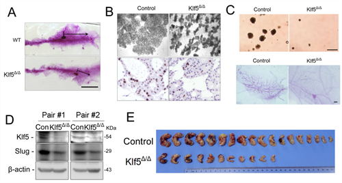 乳腺癌是女性中发病率最高的癌症,近年来的研究表明,转录因子KLF5在乳腺癌的发生发展过程中发挥重要作用,我们前期的研究表明,KLF5在乳腺癌干细胞的自我更新和维持过程中发挥关键的促进作用(Theranostics, 2016; 6(4): 533-544);另外也有研究显示KLF5在胚胎干细胞的维持中发挥重要作用,但KLF5在正常干细胞以及乳腺发育过程中的作用还没有研究报道。中科院昆明动物研究所陈策实课题组对KLF5在正常乳腺干细胞以及乳腺发育中的作用进行深入研究,首先发现乳腺Klf5敲除的小鼠乳腺发育受到明显的抑制,尤其在妊娠以及哺乳阶段的发育显著延缓;其次,乳腺Klf5敲除的小鼠乳腺中干细胞的比例显著下降;机制探索发现乳腺Klf5敲除引起乳腺细胞中干细胞相关因子Slug的表达下调,进而导致干细胞的减少;最后,利用PyMT癌基因致癌模型,我们发现乳腺Klf5敲除能够显著降低癌基因诱导的乳腺癌的产生和生长。这项研究不仅发现转录因子KLF5在乳腺干细胞的维持和乳腺发育中发挥重要作用;而且发现KLF5在乳腺癌发生中的推动作用,进一步为发掘KLF5作为临床乳腺癌治疗靶标提供了新的支持证据。研究论文2018年8月被国际权威杂志Journal of Pathology 接受并在线发表,文章链接https://doi.org/10.1002/path.5153。本研究得到了国家重点研发计划,国家自然科学基金委,中国科学院以及云南省科技厅的资助。