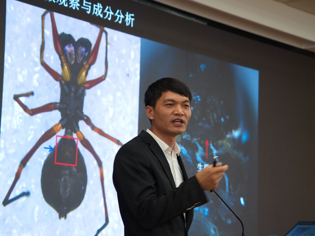陈占起介绍发现和研究大蚁蛛哺乳并抚育后代现象的详细过程